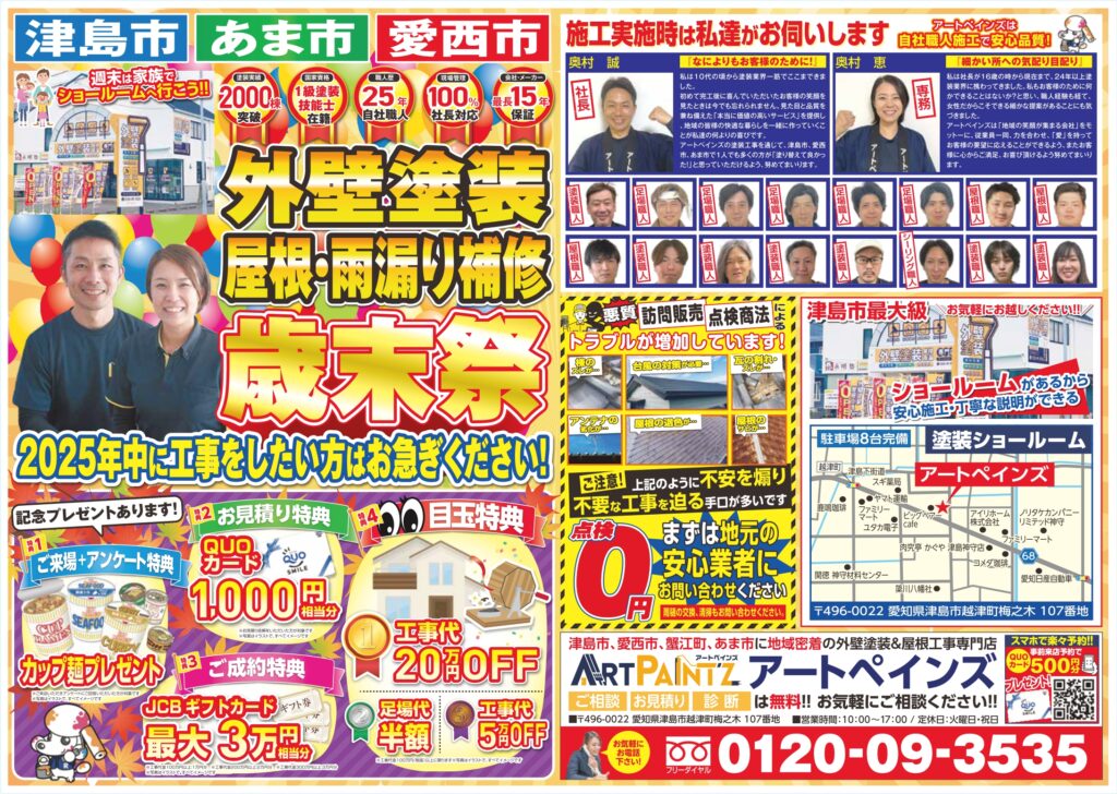 津島市、あま市、愛西市で外壁塗装、屋根塗装、雨漏り補修のことなら、外壁塗装&屋根&雨漏り専門店アートペインズ