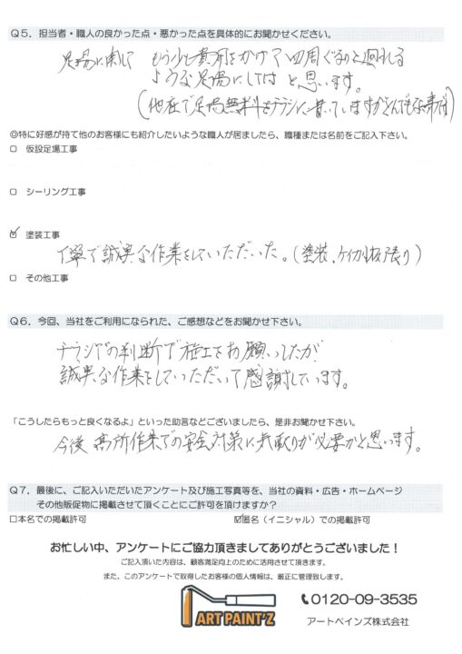 チラシでの判断で施工をお願いしたが、誠実な作業をしていただいて感謝しています。