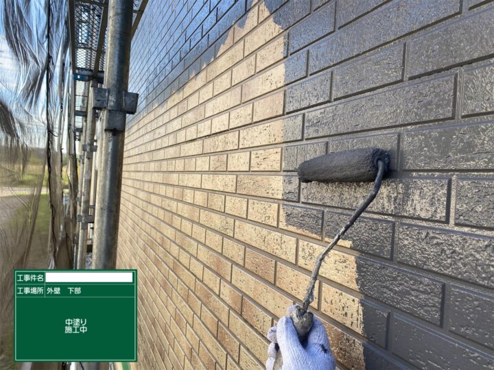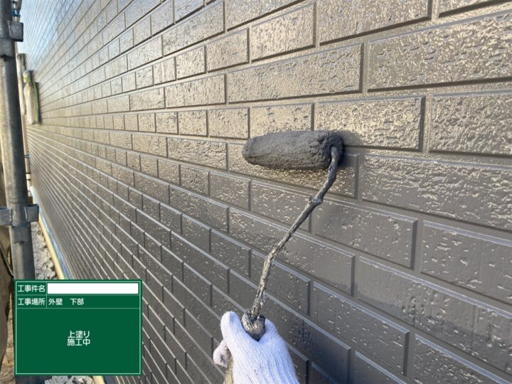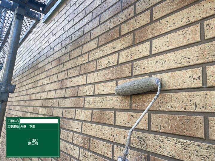 外壁材と上塗り材の密着をよくする為の接着剤、塗り残しが無いように施工します。