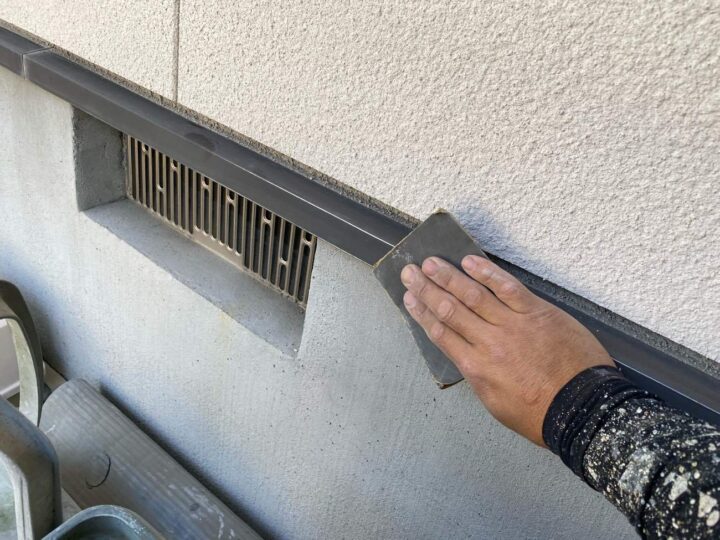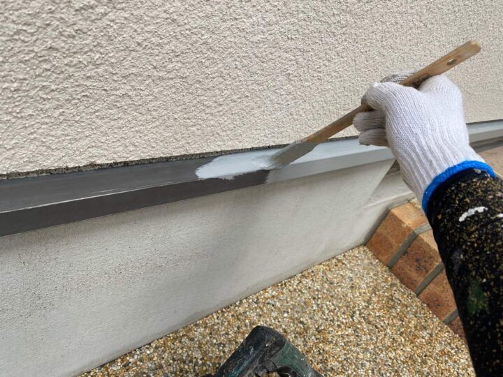 外壁材と上塗り材の密着をよくする為の接着剤、塗り残しが無いように施工します。